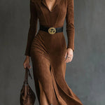 Šaty Felicity Retro Western Styl Límcový Falešný Semiš Rozparkový Midi kombinují vintage západní styl s moderní elegancí. Vyrobeny z měkkého falešného semiše, mají lichotivý límcový výstřih a přizpůsobený střih, který se v pase zužuje. Jemný rozparek šatů dodává dotek odvážné sofistikovanosti, zatímco přiložený pásek dále definuje vaši siluetu. Ideální pro denní i večerní nošení, tyto midi šaty lze kombinovat s botami nebo podpatky pro kompletní, stylový vzhled.