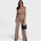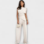 Skulpturální elegance s moderním nádechem: Komplet Sofia kombinuje asymetrický top s širokými kalhotami pro siluetu, která je stylová a elegantně splývá. Ideální pro zvláštní příležitosti nebo pro snadné vylepšení vašeho každodenního vzhledu.